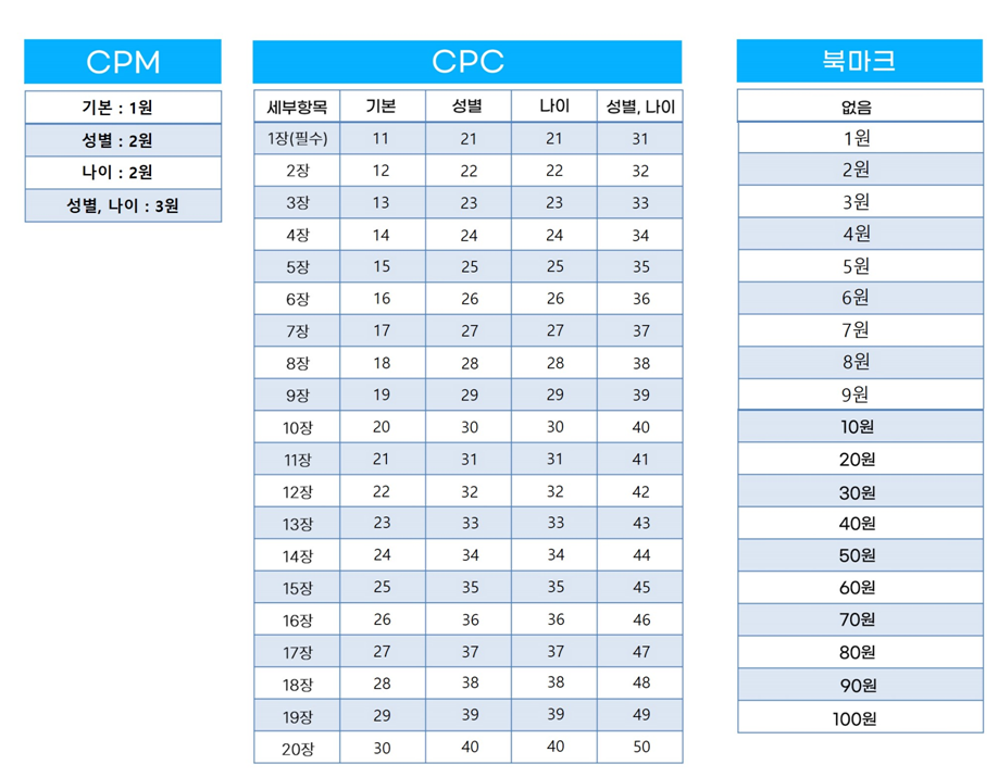 2. 월 1,000원/건당CPM, CPC, 북마크 마다 광고금액