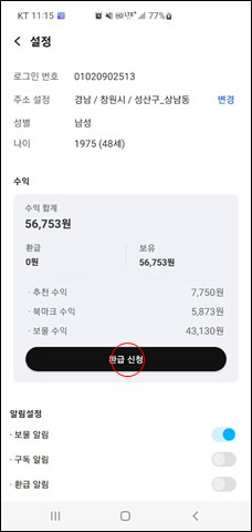환급 신청 버튼를 누르세요